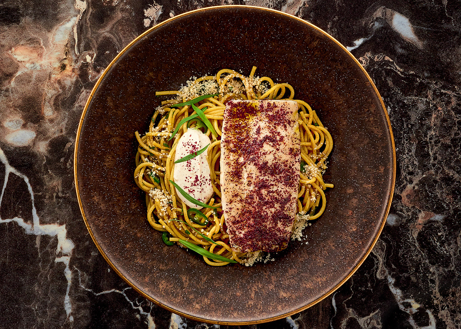 Сам сибас я готовлю со сливочным маслом и большим количеством сумаха — красновато-бордовой специи с кислым вкусом. Готовлю на пару, потому что это один из самых мягких и аккуратных способов приготовления рыбы. И лучшего гарнира, чем лимонная паста к этой рыбе просто не придумаешь.
