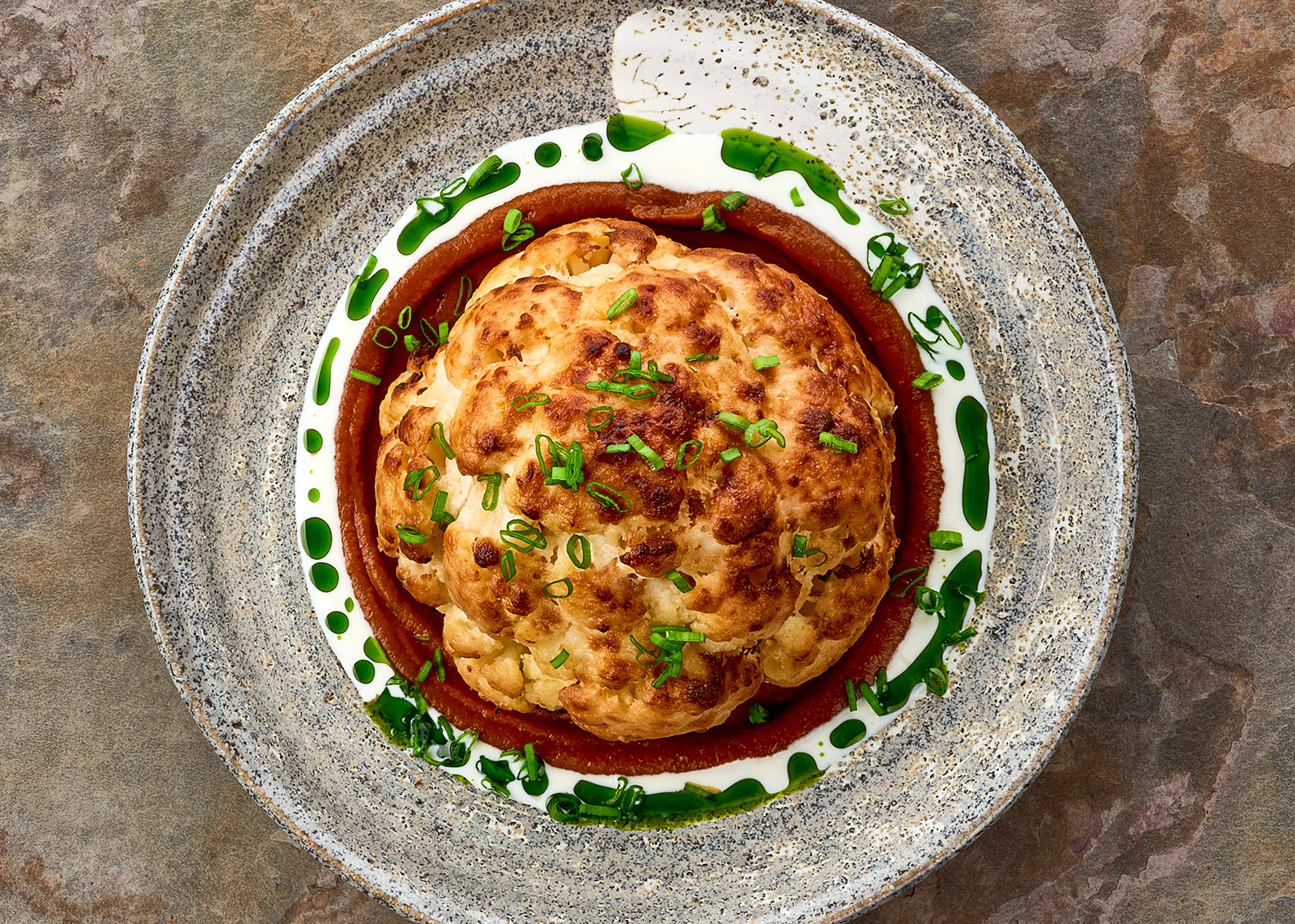Вторым и, возможно, самым важным блюдом стала цветная капуста — самая обычная целая головка цветной капусты, немного приваренная, а затем запеченная до слегка горелого цвета, которую подавали с тахиной и солью. Это простое на первый взгляд блюдо Эяль Шани возвел на пьедестал. Благодаря соцсетям всего за пару лет капуста просто разлетелась по миру, став одним из символов израильской кухни. Ее готовят все, кому не лень, и подают именно таким способом.