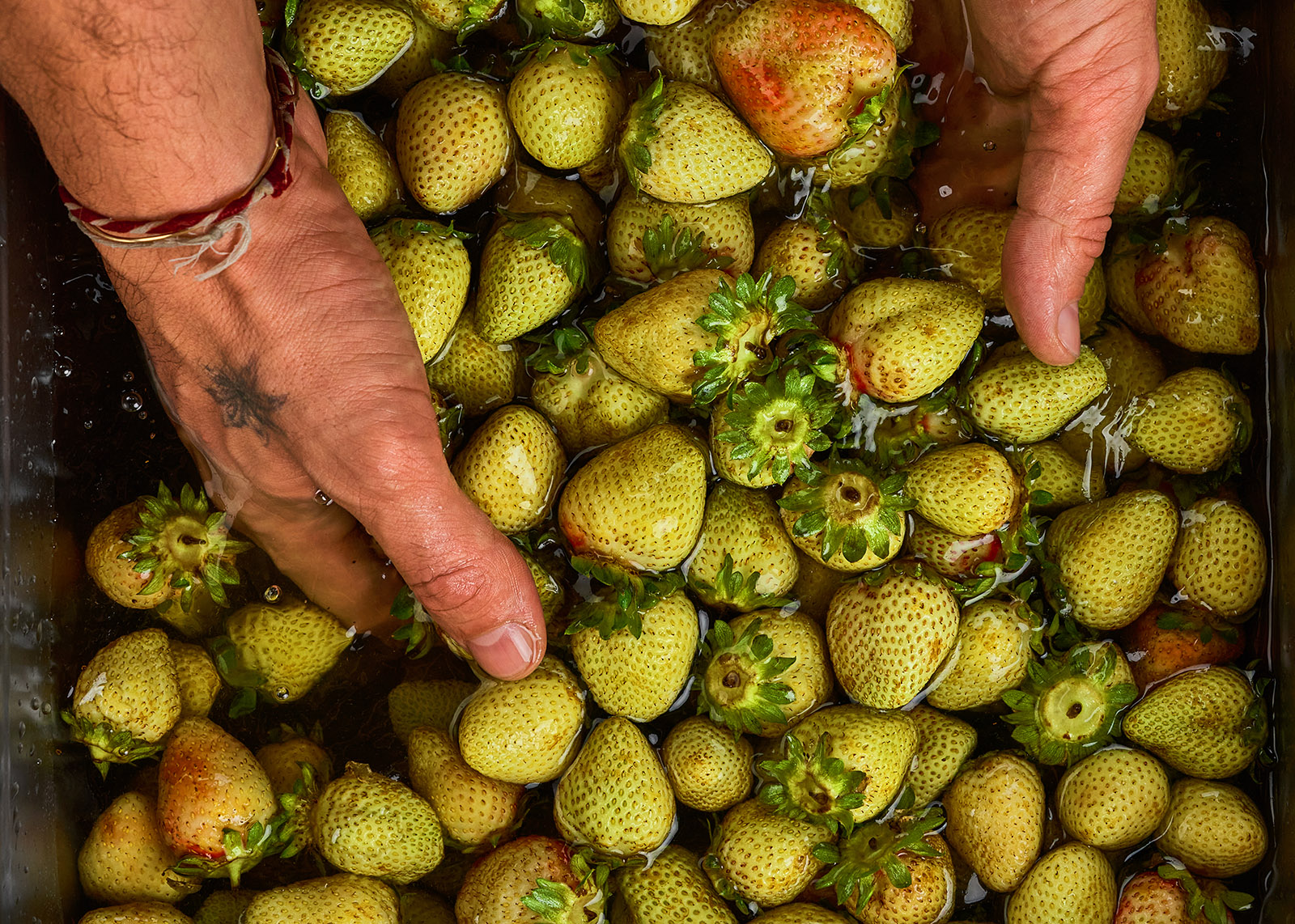 Ладно, думаю, пусть стоит, есть ведь не просит. И так она простояла у нас на кухне несколько дней. Пока мне не пришло в голову ее засолить. Сделали рассол как для огурцов — уксус, сахар, соль — закинули в него клубнику и отправили все это в банку. Оставили на 2 дня в комнатной температуре, а потом убрали в холодильник. Через неделю попробовали — у нас получился абсолютно крутой продукт.Окей, говорю, если ягоды получились вкусными вот таким простым способом, то что будет, если их заквасить? Я выпросил еще несколько килограмм зеленой клубники у того поставщика (который, к слову, смотрел тогда на меня как на умалишенного — где это видано, чтобы оптом покупали неспелые ягоды?!). В общем, мы попробовали вакуумную лакто-ферментацию и… уже через неделю я заказал у поставщика 40 килограмм зеленой клубники. Так в «Любимом Дяде» появился очень интересный ингредиент, который мы добавляем к рыбным тартарам.Самое забавное в этой истории то, что спустя буквально пару месяцев после того, как я сделал эту зеленую клубнику, я увидел ее в Instagram Дэвида Зильбера. И здесь, внимание, вопрос: кто из нас был первым? Свою клубнику я сделал в июне, а его клубника — с бузиной и соком из белой смородины — появилась в июле. Гениальные идеи приходят в светлые головы в одно время.